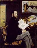Manet übernahm häufig Motive, aus Werken Alter Meister wie etwa Velazquez, Frans Hals, Tizian, Tintoretto, Giorgione, Brouwer und Delacroix , von dessen Bild »Dante und Vergil in der Hölle« er sich besonders beeindruckte zeigte.. In seinem Bild "Der Absinthtrinker" (Kopenhagen), 1859 lassen sich noch Einflüsse Coutures erkennen. In einigen seiner Bilder zeigen sich vor allem spanischen Anregungen wie z.B. von Vesalquez. Es traten bald auch japanische Einflüsse auf. Zusätzlich prägte ihn die begegnung mit Francisco de Goya 1865. Alle diese Tendenzen zeigten sich in Manets Einsendungen zum Salon von 1868 und von 1869: japanisch inspiriert ist das Porträt Émile Zola, modern "Das Frühstück im Atelier", goyesk "Der Balkon" (Paris) aus der Zeit um 1868-69. Zu seinen Freunden zählten, unter anderem Bazille, Monet und Renoir oder auch Antonin Proust. Nach dem Kriege hatte Manet Erfolg: Die Kritik war günstig, der Kunsthändler Durand-Ruel kaufte 1872 eine beträchtliche Anzahl seiner Bilder zu verhältnismäßig hohen Preisen und auch Gönner fanden sich nun, unter denen der Sänger Faure hervorragte. |