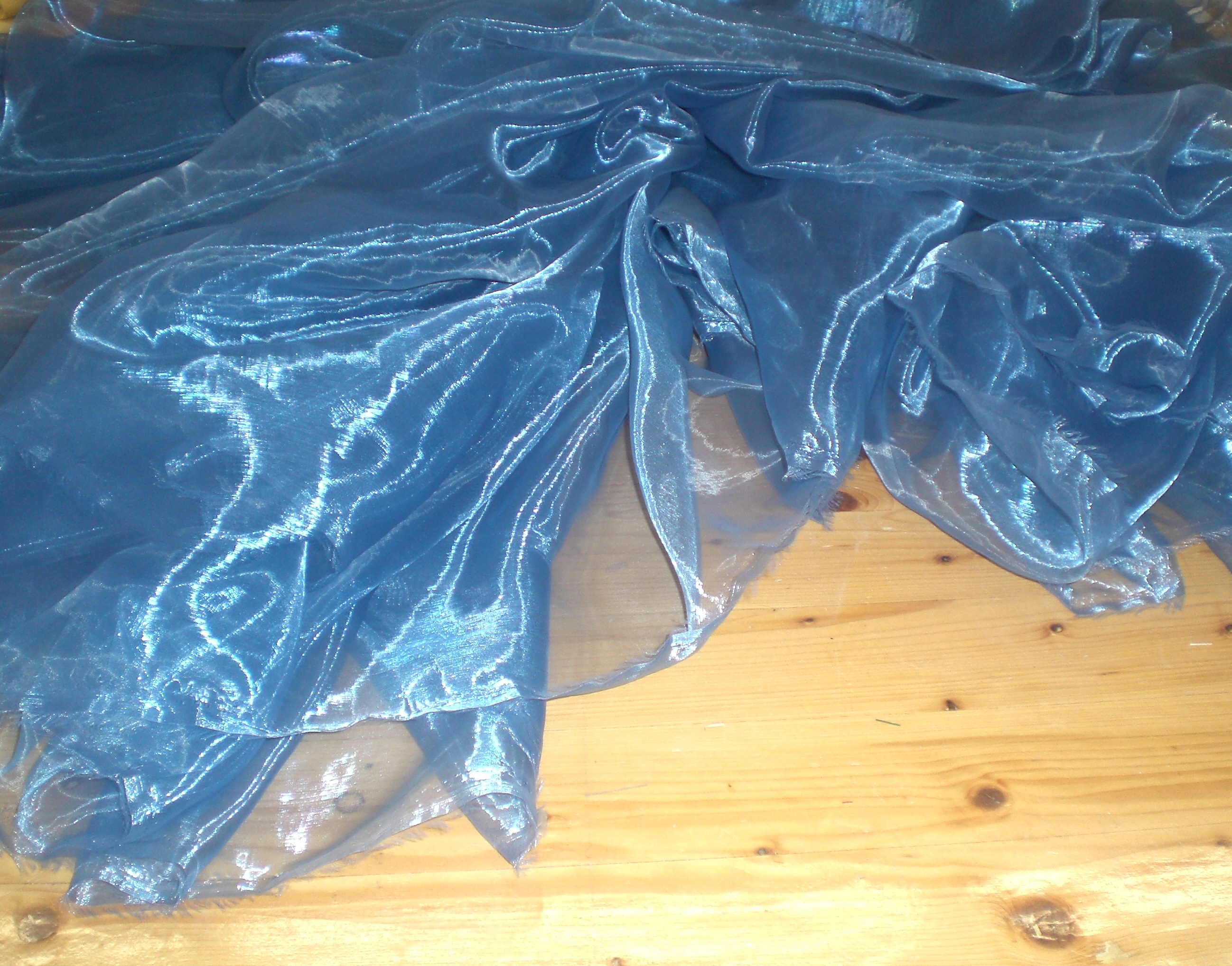 Nachträge: Ich habe zur Zeit der Arbeit an dieser Datei dekorativ mit einer Stoffbahn von 10 Metern Organza gearbeitet, einem sehr dünnen und seidig glänzenden Stoff, der sich wegen einer Härte mehr hüllt als legt. Diese Erfahrung mit dem zarten Polyestergewebe war sehr hilfreich zur weiteren Entwicklung.