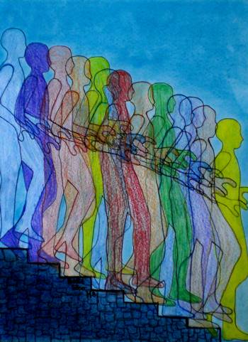 Die Schüler hatten wirklich konzentriert zu überlegen, wie die Abfolge der Bewegung beim Treppensteigen ist. Als Leitmotiv für diese Arbeit hatte ich Gerhard Richter, „Akt, eine Treppe hinab steigend“