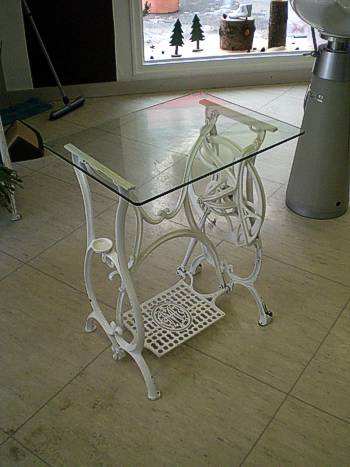 Ich fand dieses weiss lackierte und recht schwere Nähmaschinen-Untergestell mit Tretwippe und aufgelegter Glasplatte als Einrichtungsgegenstand bei meinem Friseur vor und konnte es mit der Kamera näher von allen Seiten untersuchen. Ich nahm dieses Tischchen wegen seiner geschweiften Formen als alltäglichen Gebrauchsgegenstand und als exemplarisch an.